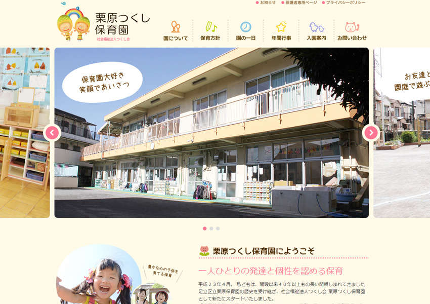 CMS Coding Design Direction Illustration モバイル 学校・保育園・塾 施設・店舗サイト 制作実績:栗原つくし保育園様 栗原つくし保育園様 SITE:栗原つくし保育園URL:https://kurihara.294.jp/AREA:東京都足立区SERVICE:保育園